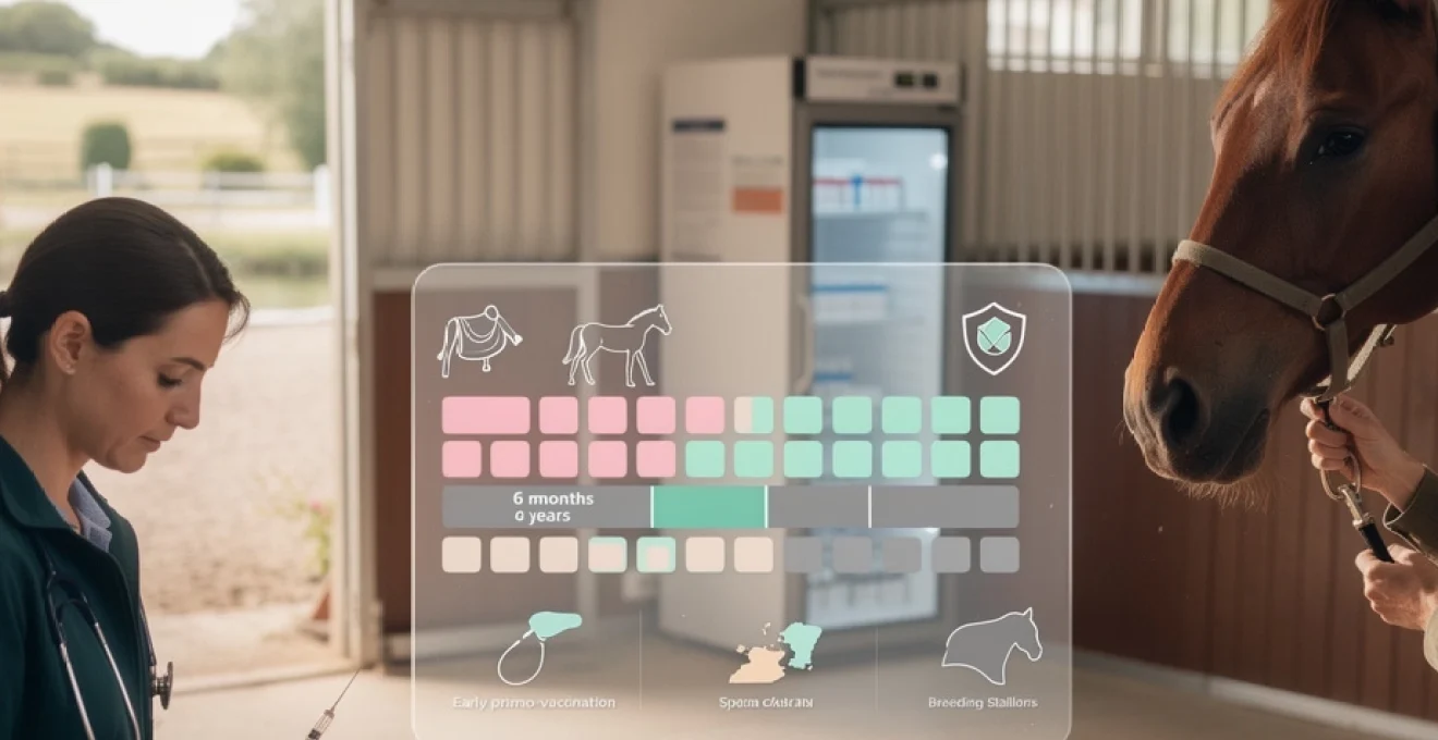 Idéalement, le vaccin contre l’AVE doit être administré chez un jeune étalon séronégatif, avant son entrée en reproduction. La primo-vaccination comporte généralement deux injections à 3 à 4 semaines d’intervalle, suivies d’un rappel annuel. Dans certains stud-books ou pour l’agrément en centre de collecte, la présentation d’un certificat de vaccination à jour et d’un résultat de sérologie ou de PCR négatif est exigée. Le calendrier de vaccins du cheval reproducteur doit donc être planifié plusieurs mois avant la saison de monte.